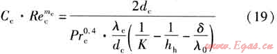 修正威爾遜法的計算前提是必須已知一側(cè)傳熱準(zhǔn)則方程的待求指數(shù),將等流速法計算得到的m作為熱側(cè)待求指數(shù)mh,設(shè)定初值C′h=Ch,這樣即可求出熱側(cè)表面?zhèn)鳠嵯禂?shù)hh,由式(6)、(17)整理得: