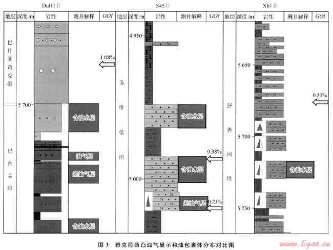 結(jié)合該區(qū)大量鉆井資料和流體包裹體系統(tǒng)檢測發(fā)現(xiàn),存在“斷接式”輸導(dǎo)體系的井區(qū)宏觀油氣顯示和微觀有機包裹體豐度(GOI,即賦存于有機包裹體的石英顆粒在所有石英顆粒中所占的比值),相比于其他井普遍較好,如:S45井在N1s宏觀上為含油層系,微觀上檢測到發(fā)黃色熒光的油包裹體和大量發(fā)弱白色熒光的氣包裹體,GOJ值范圍為0.23%~0.38%;Xh1井K1s為差油氣層,微觀上在K1b檢測到大量發(fā)亮黃色、橙黃色和藍白色熒光的油包裹體,GOI值為0.51%;DuH1井K1b為較好的含油氣層,微觀上在K1s、K1b則同時檢測到大量發(fā)黃色熒光的油包裹體和發(fā)弱白色熒光的氣包裹體,GOI值為1.08%(圖3)。