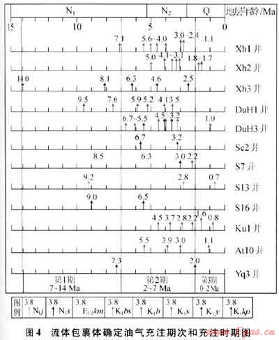 在恢復(fù)單井埋藏史和熱演化史基礎(chǔ)上,將給定埋深樣品的各期次同期鹽水包裹體平均均一溫度“投影”到標有等溫線的埋藏史圖上,對應(yīng)于時間軸上的年齡即代表油氣充注儲層的年齡[14~17]。將該區(qū)各期與有機包裹體共生的同期鹽水包裹體的均一溫度范圍投影到單井的埋藏史圖上來確定單井的油氣充注期次和時期,再綜合各單井充注期次和時期分析該區(qū)油氣充注期次和時期(圖4)。