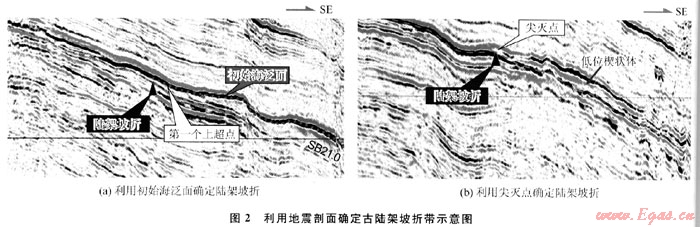 2) 確定低位楔狀體的尖滅點:地震剖面上,層序界面之上的第一個上超點較難找到,但有些地方低位楔狀體的尖滅點非常清晰,可將此點作為陸架坡折點(圖2-b)。