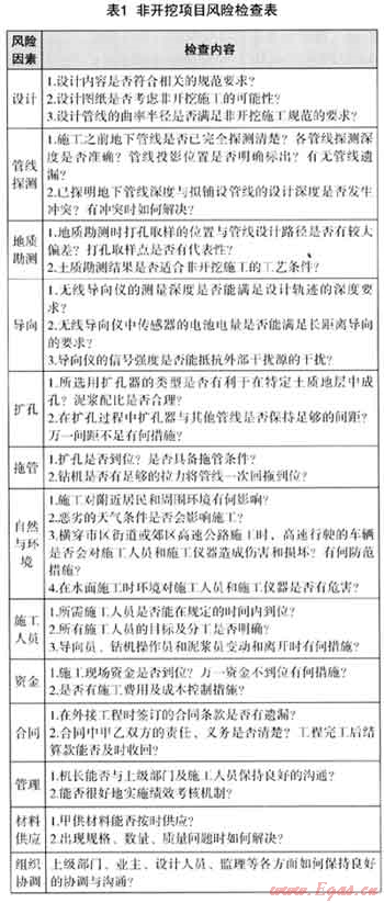 我們根據(jù)多年的非開挖施工經(jīng)驗(yàn),在實(shí)踐中逐步總結(jié),形成了一個初步的識別非開挖項(xiàng)目風(fēng)險因素檢查表,通過風(fēng)險識別檢查表,我們可以按照系統(tǒng)化、規(guī)范化的要求去識別非開挖項(xiàng)目的各種風(fēng)險因素。(見表1)