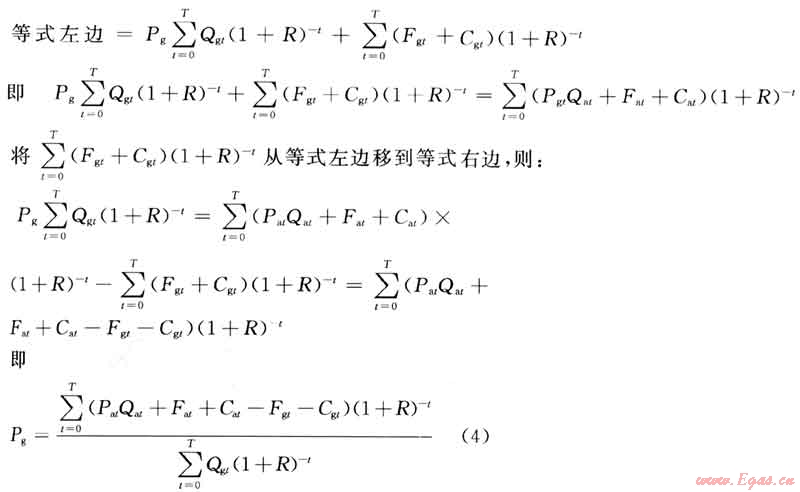 設(shè)T為使用裝置的經(jīng)濟(jì)壽命期年限;t為使用裝置經(jīng)濟(jì)壽命期內(nèi)的某1年,從開始年(0年)到第T年;Pg為替代前提下天然氣長期使用經(jīng)濟(jì)價值(它是用計算期開始年初現(xiàn)值度量的計算期內(nèi)的平均值,常數(shù));Qgt為達(dá)到相同使用效果情況下t年需要消耗的天然氣量;Fgt為達(dá)到相同使用效果情況下建設(shè)使用天然氣的裝置t年需要投入的固定資產(chǎn)投資;Cgt為達(dá)到相同使用效果情況下使用天然氣裝置t年需要發(fā)生的除折舊和天然氣費用以外的其他完全成本(其中還包括營業(yè)費用、財務(wù)費和管理費);R為企業(yè)內(nèi)部收益率;Pat為t年等價替代物價格;Qat為達(dá)到相同使用效果情況下t年需要消耗的替代物數(shù)量;Fat為達(dá)到相同使用效果情況下建設(shè)使用替代物的裝置t年需要投入的固定資產(chǎn)投資;Cat為達(dá)到相同使用效果情況下使用替代物的裝置t年需要發(fā)生的除折舊和替代物費用以外的其他完全成本(其中還包括營業(yè)費用、財務(wù)費和管理費)。