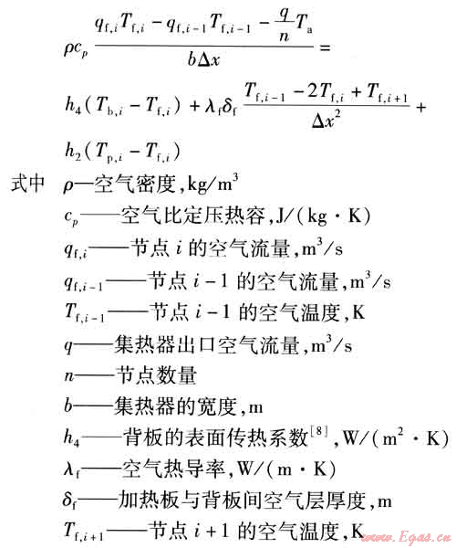 對(duì)于吸熱板與背板之間的流體,節(jié)點(diǎn)i的能量平衡方程為: