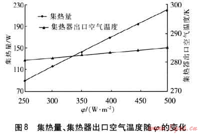 保持其他參數(shù)不變,集熱量、集熱器出口空氣溫度隨φ的變化見圖8。由圖8可知,隨著φ的增大,吸熱板溫度升高,與流道內(nèi)空氣的溫差加大,對(duì)流傳熱增強(qiáng),集熱器出口空氣溫度升高,集熱量也隨之升高。