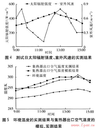 選取2009年10月初天氣晴好的一天作為測(cè)試日,測(cè)試時(shí)間為9:00—15:00。測(cè)試日太陽輻射強(qiáng)度、室外風(fēng)速的實(shí)測(cè)結(jié)果見圖4。環(huán)境溫度的實(shí)測(cè)結(jié)果與集熱器出口空氣溫度的模擬、實(shí)測(cè)結(jié)果見圖5。