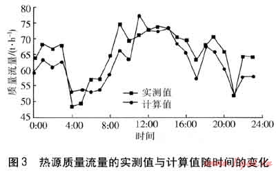 熱源質(zhì)量流量的實(shí)測(cè)值與計(jì)算值隨時(shí)間的變化見圖3。由圖3可知,除9:00和17:00偏差較大外,其余時(shí)刻相對(duì)誤差均在±10%以內(nèi),全天質(zhì)量流量的計(jì)算值與實(shí)測(cè)值的平均相對(duì)誤差為-4.1%。由于9:00與17:00為上、下班時(shí)間,管網(wǎng)流量波動(dòng)較大,系統(tǒng)處于非穩(wěn)態(tài),因此計(jì)算值與實(shí)測(cè)值偏差較大。