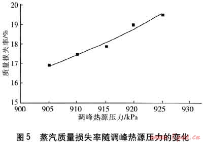 調(diào)峰熱源的主要作用是調(diào)峰,必須合理調(diào)節(jié)調(diào)峰熱源壓力以保證供汽壓力。采用10:00用戶質(zhì)量流量實(shí)測(cè)值與熱源壓力實(shí)測(cè)值計(jì)算調(diào)峰熱源出口壓力降低對(duì)管網(wǎng)運(yùn)行狀況的影響。主熱源出口壓力保持928kPa,調(diào)峰熱源壓力由實(shí)際的925kPa降低至能夠滿足末端用戶壓力的905kPa,用戶流量不變。蒸汽質(zhì)量損失率隨調(diào)峰熱源壓力的變化見圖5。