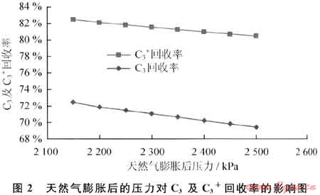 由圖2可知天然氣膨脹后的壓力越低,則脫乙烷塔的分離效果越好,裝置的C3及C3+回收率越高[3]。這是因為天然氣膨脹時有足夠壓差就會產(chǎn)生足夠冷量,從而使C3及C3+回收率增加。