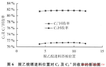 脫乙烷塔的進料位置對C3及C3+回收率的影響如圖6所示。由圖6可知,C3及C3+回收率隨著脫乙烷塔的進料位置自塔頂向下移動而緩慢上升,約在第8塊塔板進料達到最大值,繼續(xù)自塔頂下移進料位置會使得回收率下降。