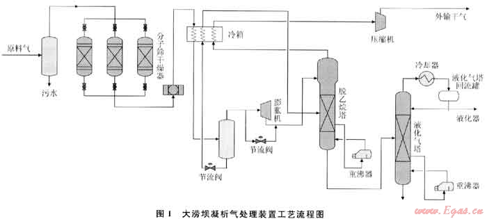 脫水后的天然氣經(jīng)粉塵過濾器除去分子篩粉塵,再經(jīng)冷箱預(yù)冷后,進入低溫分離器,將部分重烴液體從氣相中分離出來。離開低溫分離器的氣相進入膨脹/壓縮機組的膨脹端,經(jīng)過膨脹降溫后的物流作為脫乙烷塔塔頂分離器的進料。離開低溫分離器的液相經(jīng)過節(jié)流閥后進入冷箱,在冷箱復(fù)熱后作為脫乙烷塔中部的進料。