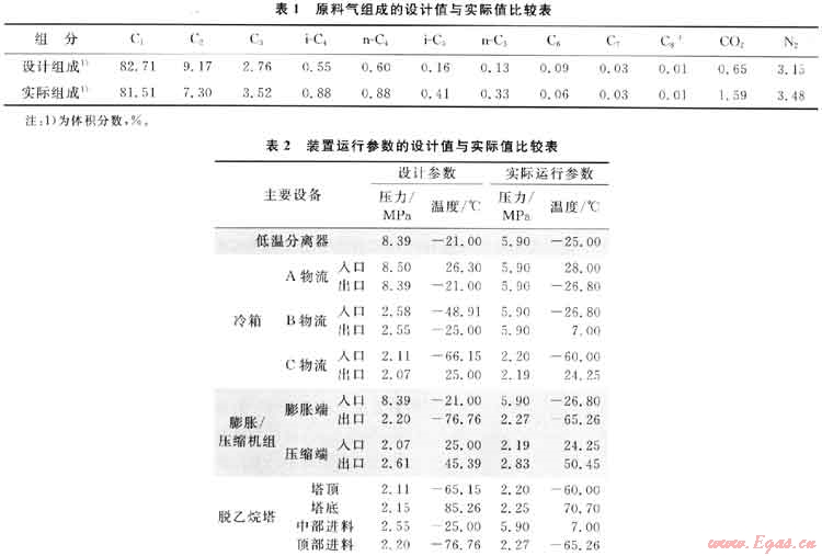 而實際生產(chǎn)中原料天然氣氣量增加為40×104m3/d,天然氣進裝置的壓力約為6.00MPa,溫度約為25.O0℃,外輸干氣壓力約為2.80MPa,液化氣產(chǎn)量為29.0t/d,輕油產(chǎn)量為6.6t/d,外輸氣烴露點為-56.O0℃,外輸氣中C3組成為0.0113%(體積分數(shù))。進裝置的天然氣的組成及裝置運行參數(shù)的設(shè)計值與實際值比較表分別見表1、2。