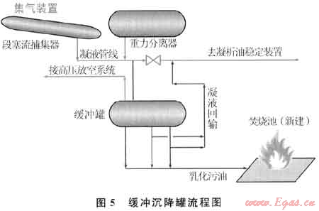 一、二級分離器排出的液體匯合后一起進(jìn)入緩沖沉降罐,經(jīng)緩沖沉降罐初步穩(wěn)定的油、水混合液輸往下游凝析油穩(wěn)定裝置的三相分離器進(jìn)行油、氣、水三相分離處理。