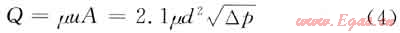 噴嘴孔徑的大小直接影響到水射流的壓力、出口速度和噴嘴的流量。在噴嘴出口截面內(nèi)外兩點(diǎn)間應(yīng)用伯努利方程,忽略兩點(diǎn)之間的高度差,可得出關(guān)系式: