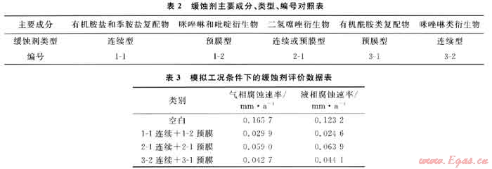 參考SY T 5273—2000油田采出水用緩蝕劑性能評(píng)價(jià)方法標(biāo)準(zhǔn),結(jié)合普光氣田集輸工藝,研究了連續(xù)型和預(yù)膜型緩蝕劑的模擬工況評(píng)價(jià)方法,評(píng)價(jià)條件同1.3。