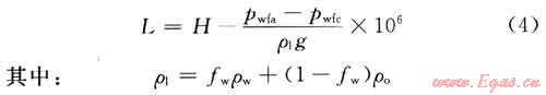 式中L為油管中積液的深度,m;H為產(chǎn)層中部深度,m;pwfa實測井底流壓,MPa;pwfc為計算得到井底流壓,MPa;ρ1為地層產(chǎn)液的密度,kg/m3;ρo為地層產(chǎn)液中油的密度,kg/m3;ρw為地層產(chǎn)液中水的密度,kg/m3;fw為地層產(chǎn)液的含水率。