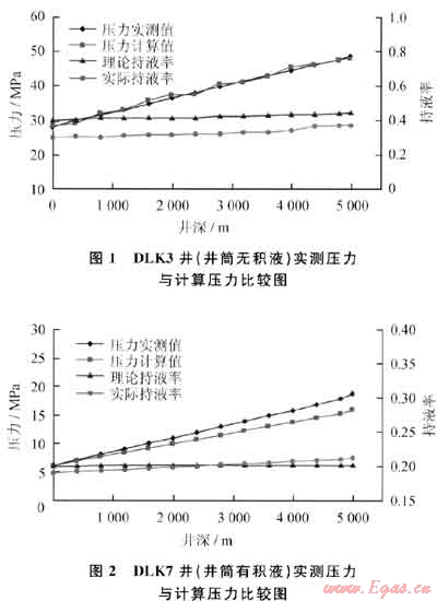 利用式(3)選定的模型,筆者在對該區(qū)塊大量井井筒壓力分析計算時發(fā)現(xiàn):①井筒不積液時,計算壓力分布曲線與實測壓力分布曲線吻合較好(圖1),其實際持液率小于理論持液率[2],井筒無積液。大澇壩多口井計算表明,當井筒無積液時,其優(yōu)選模型的計算壓力與實測壓力的平均誤差2%。②當井筒有積液時,計算壓力低于實測壓力且誤差較大(圖2),其實際持液率小于理論持液率,井筒有積液。