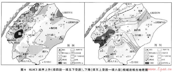 SLSC2層序基準面下降期對應須五上亞段及須六段沉積期,該時期屬于龍門山活動相對寧靜期,古地形相對變緩,沉積體系演變?yōu)橐匀侵?淺湖沉積為主,須五段早期的辮狀河三角洲向曲流河三角洲演變,湖盆中心位于彭山-射洪一線,呈北東向展布,明顯受古龍門山控制。三角洲前端淺湖砂壩及河口壩較湖盆擴張期規(guī)模亦明顯變小,主要由龍門山前緣川西坳陷北段安縣-中壩地區(qū),米倉山-大巴山前萬源-宣漢、川東南川-重慶、川南宜賓-威遠地區(qū)提供物源并發(fā)育規(guī)模相對較小的三角洲沉積。受晚印支運動影響,盆地北部安縣-劍閣一帶須五段沉積后隆升剝蝕缺失,須六段無沉積。