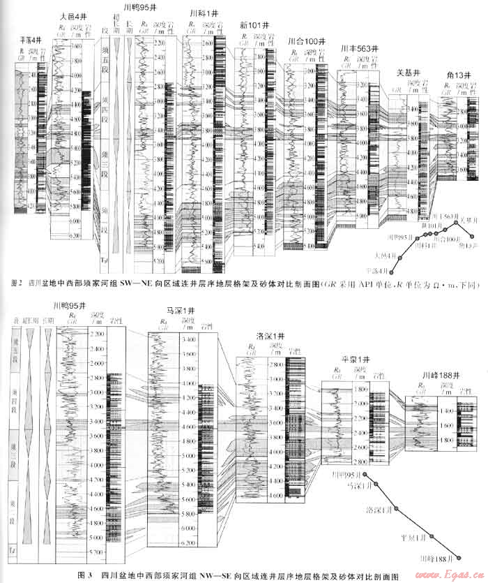須四段沉積早期,受安縣運動影響,在須四段底部普遍發(fā)育砂礫巖沉積,連井地層對比剖面上可見(圖2、3),該時期,不同物源區(qū)砂礫巖體厚度不一,典型如川西坳陷以安縣以南的新場地區(qū)相對較厚,這主要與安縣地區(qū)大幅度隆升剝蝕有關。受超長期基準面旋回影響,須上盆水體逐漸加深,須四段中后期至須五段早期,湖盆擴張明顯,期間沉積了須四段中上部砂巖,與須二段砂體疊加樣式相似,由川西坳陷中南段湖盆中心向東、向南、向北西斜坡超覆退積,宏觀上依然具有呈階梯狀分布特點,尤其體現在須四上亞段砂體的分布特征上,在川西坳陷中段新場-合興場-豐谷地區(qū),須四段頂部砂體向東階梯狀分布特征已經得到三維地震剖面及鉆井的證實,典型如川合100井須四段頂部第一套砂體在以西的新場地區(qū)不發(fā)育,相變?yōu)槟?。但總體上看這一特點不如須二段清楚,這與龍門山抬升使川西坳陷物源復雜化有關。