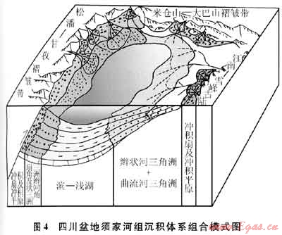 沖積扇-扇三角洲-湖泊模式于四川盆地須四下段安縣-中壩劍閣地區(qū)最為典型。該模式的特點是湖泊的水體靠近物源區(qū)的出口,在山口與湖泊之間缺少河流、沖積平原這一相帶,而是沖積扇直接入湖形成扇三角洲沉積,隨著扇三角洲不斷地向湖盆推進,須四段扇三角洲平原亦隨之拓寬而演變?yōu)闆_積平原,因而此模式可能隨時間的推移而被辮狀河三角洲取代。