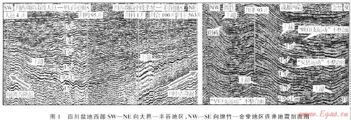 受資料限制,多數學者沉積相分析主要來自于地表露頭及鉆井資料,地震層序分析是獲得本文不同于前期地質認識的重要依據,主要線索包括地震剖面上地層厚度變化關系、層間接觸關系,層段內砂體或砂層組分布及疊加樣式等。主要選取了與龍門山或川西坳陷平行、垂直的NE向和NW 向區(qū)域二三維地震剖面進行層序格架與砂體疊加樣式分析。