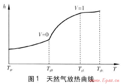 天然氣液化放熱的溫度-比焓(即T-h)曲線由3段平滑曲線組成,分割放熱曲線的點(diǎn)的相應(yīng)溫度是露點(diǎn)Tg1(氣化率V=1)及泡點(diǎn)Tg0(此時氣化率V=0),此2點(diǎn)也是曲線的2個拐點(diǎn)。天然氣放熱曲線見圖1。