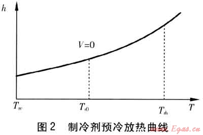制冷劑預(yù)冷放熱曲線見圖2。與天然氣放熱曲線不同的是,制冷劑預(yù)冷放熱曲線只有一個拐點(diǎn),在V=0處。因?yàn)闈M足經(jīng)濟(jì)技術(shù)條件的制冷劑必然有必要數(shù)量的重?zé)N,其含量遠(yuǎn)大于天然氣中的重?zé)N含量,故制冷劑在加壓、水冷至常溫后,已處于氣、液兩相狀態(tài),其進(jìn)入冷箱后以潛熱方式放熱,不會出現(xiàn)V=1的拐點(diǎn)。與天然氣液化放熱曲線一樣,T<Tr0段曲線斜率小于T>Tr0段曲線斜率。