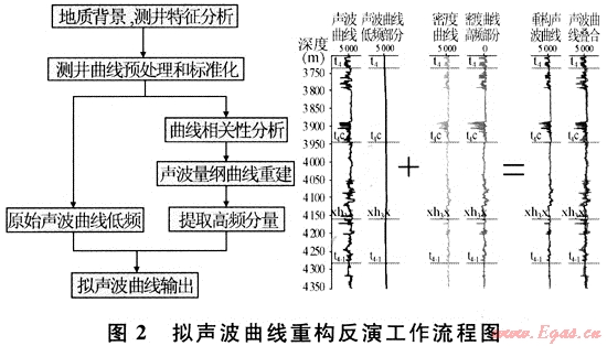 將密度曲線(xiàn)的高頻信息加入到速度曲線(xiàn)的低頻背景中去,得到具有密度信息的偽速度曲線(xiàn),然后將其與密度曲線(xiàn)乘積,得到擬波阻抗曲線(xiàn),其流程見(jiàn)圖2。原始波阻抗與密度的相關(guān)系數(shù)為0.63,重構(gòu)后波阻抗與密度的相關(guān)系數(shù)為0.78,重構(gòu)后波阻抗與原始波阻抗的相關(guān)系數(shù)為0.81??梢?jiàn)重構(gòu)后,密度與擬聲波曲線(xiàn)得到的波阻抗相關(guān)性得到了提高。重構(gòu)后的聲波曲線(xiàn)完成的合成記錄與原始合成記錄一致,質(zhì)量更好。