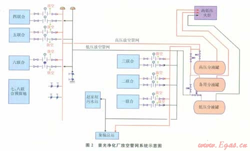放空管網(wǎng)系統(tǒng)包括從各系列天然氣凈化裝置內(nèi)的放空閥后至高低壓放空分液罐的部分。每系列裝置管廊上的高低壓放空總管經(jīng)位于裝置界區(qū)的高低壓分液罐分離泄放氣中攜帶的脫硫、脫水溶劑后,匯入東西區(qū)高低壓放空管網(wǎng)。東區(qū)高低壓放空管網(wǎng)主要負(fù)責(zé)第一、二、三聯(lián)合天然氣凈化裝置、趙家壩污水站及集氣總站的放空需要,西區(qū)高低壓火炬放空管網(wǎng)主要負(fù)責(zé)第四、五、六聯(lián)合天然氣凈化裝置的放空需要。東西區(qū)高壓放空管網(wǎng)并行進(jìn)入高壓放空分液系統(tǒng),東西區(qū)低壓放空管網(wǎng)匯合成低壓放空總管后進(jìn)入低壓放空分液系統(tǒng)。