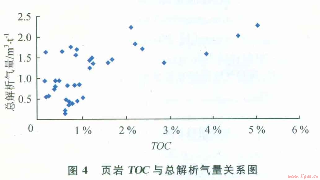 圖3是頁巖氣的總解析氣量與頁巖的孔隙度的關(guān)系圖,從圖中可以看到該頁巖氣藏的孔隙度與總解析氣量并沒有明顯關(guān)系。圖4是頁巖的總解析氣量與TOC關(guān)系圖,從圖中可以看到兩者存在著明顯的正相關(guān)關(guān)系,隨著頁巖的有機質(zhì)含量的增加,頁巖的總解析氣量也是增加的。美國5大頁巖具有豐富的有機質(zhì)含量,其TOC大多介于l.5%~20%,通常認為總有機質(zhì)含量超過0.5%的頁巖是具有潛力的烴源巖。通過對該頁巖氣藏巖心的有機地化分析,其TOC介于0.5%~5%,其TOC使其可能成為具有潛力的烴源巖。根據(jù)美國和加拿大的勘探開發(fā)結(jié)果,對于熱成因的頁巖氣藏,形成頁巖氣的頁巖有機質(zhì)成熟度(R。,)值為0.4%~3.o%。陔頁巖氣藏的R。值范圍為2.75%~3.92%,R。值超過3%說明處于過成熟范圍,會影響頁巖氣體的吸附量。