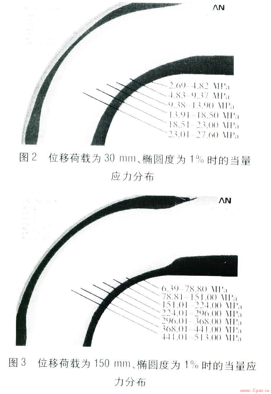 最高循環(huán)溫度為130℃,安裝溫度為l0℃,彎管內(nèi)表面施加l.6 MPa的壓力荷載。在對直臂施加不同位移荷載,以及不同橢圓度下對彎頭的當(dāng)量應(yīng)力分布進(jìn)行模擬。直臂分別施加l0、30、50、80、150、200 mm的位移荷載,橢圓度變化范圍為l%~20%。位移荷載分別為30、150mm、橢圓度為1%時的當(dāng)量應(yīng)力分布見圖2、3,各個色塊的當(dāng)量應(yīng)力范圍標(biāo)注在圖中。由圖2、3可知,彎頭中線部位當(dāng)量應(yīng)力最大。在對直臂施加不同位移荷載時,彎頭中線部位當(dāng)量應(yīng)力不同。對直臂施加的位移荷載越大,彎頭所受當(dāng)量應(yīng)力越大。