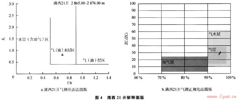 在2867.62~2871.97m井段取心,獲熒光級巖心2.32m,出筒時油氣味淡,巖心表面及氣孔局部一普遍冒氣,噴照熒光10%,暗黃色,弱發(fā)光,系列對比11級,乳黃色,氣測全烴由0.386 9%↑3.5623%,組分出至C5;氣測正規(guī)化圖版解釋為氣層(圖4-a),氣測形態(tài)法解釋為氣水同層(圖4-b)。后效在2867.62m有含水跡象,錄井解釋為氣水同層。后在井段2865.O0~2876.00m試油,日產(chǎn)油0.12t、氣5060m3、水2.65m3,試油結(jié)論為氣水同層。