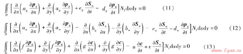 本文討論的是非穩(wěn)態(tài)的氣水滲流、氣氣擴(kuò)散問題,各參數(shù)不僅是空間域的函數(shù),而且是時(shí)間域的函數(shù),因此建立有限元方程時(shí)采用部分離散的方法[7]。對空間域的離散采用Galerkin有限元方法,對時(shí)間域的離散采用有限差分法,把型函數(shù)僅表示成空間坐標(biāo)的函數(shù),而節(jié)點(diǎn)的函數(shù)值則是時(shí)間t的函數(shù)。G表示一個(gè)有界的可度量幾何形體,在此表示積分區(qū)域。當(dāng)G為平面有界閉區(qū)域時(shí),記為D;格林公式中,當(dāng)G為空間有限曲線段時(shí),記為Γ。