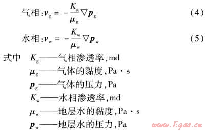 考慮氣水相流動(dòng)時(shí)分別服從達(dá)西滲流定律,則有運(yùn)動(dòng)方程: