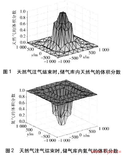 之后開始向儲(chǔ)氣庫注入天然氣,運(yùn)行到第116天時(shí),累積注入量(10022400m3)約達(dá)到目標(biāo)注氣量,停止注氣。天然氣注入結(jié)束時(shí),儲(chǔ)氣庫內(nèi)天然氣及氮?dú)獾捏w積分?jǐn)?shù)見圖1、2。由圖1、2可知,隨著天然氣的注入,天然氣逐漸將氮?dú)庀蛑車?qū)開,因而注采井周圍區(qū)域?yàn)榧兲烊粴鈪^(qū);由于氣體擴(kuò)散,天然氣與氮?dú)庀嗷交欤蚨鴱淖⒉删饾u向外,天然氣的體積分?jǐn)?shù)逐漸減小,氮?dú)獾捏w積分?jǐn)?shù)逐漸增大,形成天然氣與氮?dú)獾幕旌蠋?;再逐漸向外,為純氮?dú)鈪^(qū)。