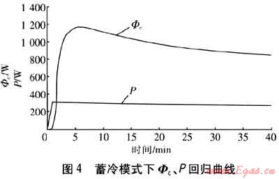 由實(shí)驗(yàn)結(jié)果擬合的蓄冷模式下Φc、P回歸曲線見圖4。由圖4可知,在壓縮機(jī)開機(jī)的第1min,由于制冷循環(huán)剛開始,而且換熱過程也需要消耗時(shí)間,因此換熱器進(jìn)出水溫度相差不大,Φc也很小。在運(yùn)行過程中P隨著冷凝壓力、蒸發(fā)壓力的下降而逐漸降低。