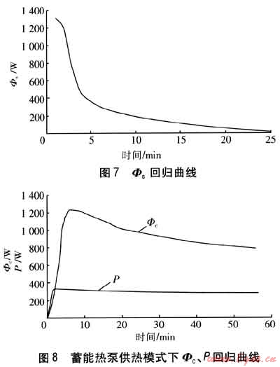 由實(shí)驗(yàn)結(jié)果擬合的蓄能熱泵供熱模式下Φc、P回歸曲線見圖8。與蓄冷模式相比較,由于冷凝溫度的升高,壓縮機(jī)的功率增大。Φc的變化趨勢與蓄冷模式類似,但是由于初始溫度高于蓄冷模式,相變材料相應(yīng)可提取的液態(tài)顯熱量增加。因此,蓄能熱泵供熱模式在達(dá)到與蓄冷模式相同的蒸發(fā)壓力水平時(shí),所用時(shí)間相應(yīng)延長。