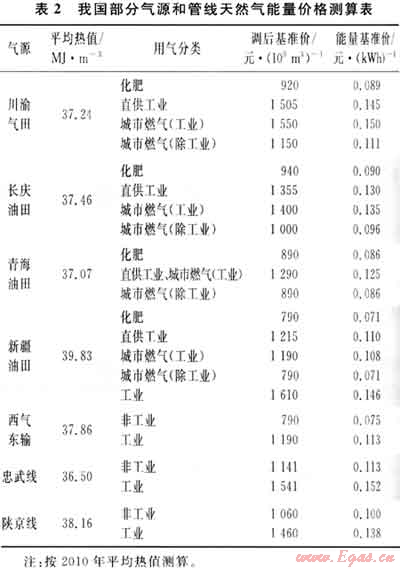 目前,我國天然氣出廠價格實行“政府指導價”,分生產(chǎn)區(qū)域制訂分用戶類型(化肥用氣、工業(yè)用氣和城市燃氣)的結(jié)構(gòu)氣價。根據(jù)國家發(fā)展和改革委員會2010年6月調(diào)整0.23元/m3后的天然氣出廠價測算的能量基準價格參見表2??梢钥闯?,受各氣田天然氣發(fā)熱量差異和價格水平差異影響,價格形式轉(zhuǎn)換后,各地區(qū)能量價格水平差別較大。
