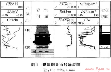 由于煤巖所具有的特殊屬性,煤層的測(cè)井響應(yīng)很特殊,比圍巖較易識(shí)別,具體表現(xiàn)為“三高兩低”的特征,即:高電阻、高聲波時(shí)差、高中子、低伽馬、低體積密度(圖1)。