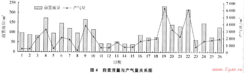 在韓城地區(qū),通過(guò)對(duì)33口井(其中30口使用活性水壓裂液,3口井使用清潔壓裂液)的排采效果進(jìn)行統(tǒng)計(jì)分析,結(jié)果表明:采用活性水壓裂液壓裂的井比用清潔壓裂液的井產(chǎn)氣效果好;產(chǎn)氣量和前置液量具有很好的正相關(guān)關(guān)系(圖4);加砂量和產(chǎn)氣量也具有一定的正相關(guān)關(guān)系,但砂比和產(chǎn)氣量之間沒有很明顯的相關(guān)性。