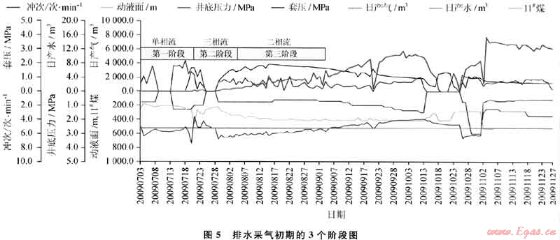 根據(jù)韓城地區(qū)的實(shí)際條件,經(jīng)過(guò)不斷摸索,制訂出適合于韓城地區(qū)的一套排采制度:①在排采初期第一階段,低排采強(qiáng)度持續(xù)10~15d,使地層重新建立壓力場(chǎng)平衡,掌握地層的供液能力;②在第二階段,井底流壓接近煤層臨界解吸壓力,這是排采初期的關(guān)鍵時(shí)刻,應(yīng)適當(dāng)加大排采強(qiáng)度,盡可能地將近井地帶的煤粉和壓裂過(guò)程中形成的遠(yuǎn)端煤粉排出,疏通近井地帶的高滲流通道;③第三階段主要是氣、液兩相滲透率反復(fù)變更階段(圖5),排采時(shí)應(yīng)保持液面的平穩(wěn)下降,不能造成壓力激動(dòng)而打破地下重新形成的壓力場(chǎng),導(dǎo)致遠(yuǎn)端滲流通道閉合,滲透率降低,這一過(guò)程一般持續(xù)時(shí)間達(dá)一個(gè)月。