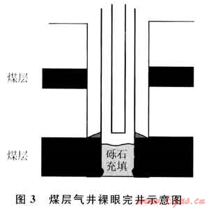裸眼完井(圖3)是指將套管下在生產(chǎn)段煤層頂,然后鉆開煤層,不進(jìn)行壓裂等增產(chǎn)措施,產(chǎn)氣煤層保持裸眼或用礫石充填。裸眼完井是一種最基本、最簡(jiǎn)單、費(fèi)用最低的完井方式,適合于埋深較淺、滲透性能好的單目的層,煤儲(chǔ)層穩(wěn)定且不容易垮塌。