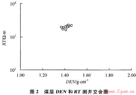 在相同程度的煤化作用下,電阻率一般反映煤巖成分和煤質(zhì),電阻率越高,表明煤層灰分越低,煤質(zhì)越好,絲炭含量和煤層受氧化是煤層電阻率降低的主要因素,低電阻往往也就直接反映了相對(duì)低的煤層含氣量;聲波時(shí)差值顯示了煤層的壓實(shí)程度和孔隙;補(bǔ)償中子則表示煤巖的含氫指數(shù);補(bǔ)償密度則指示煤巖的變質(zhì)程度和含氣量。從測(cè)井交會(huì)圖(圖2)中可以看出,該煤層的測(cè)井響應(yīng)反映出了絲炭含量低、灰分中等、弱含水的特征。