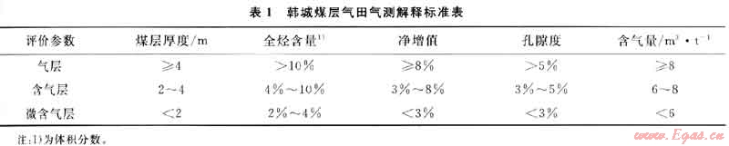 地質(zhì)錄井是煤層氣勘探開發(fā)中最常應(yīng)用的錄井技術(shù),包括鉆時(shí)、巖屑、巖(煤)心、鉆井液性能、氣測(cè)等項(xiàng)目的錄取工作。其中,氣測(cè)錄井是指直接測(cè)定鉆井液攜帶的破碎煤層中可燃性氣體含量的一種測(cè)井方法,然后根據(jù)氣層解釋標(biāo)準(zhǔn)(表1),結(jié)合巖石電性特征,判定氣測(cè)異常層是氣層還是含氣層。