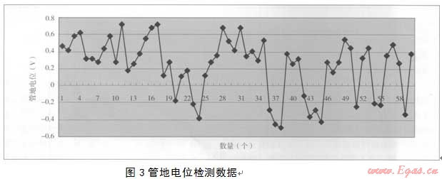 對(duì)整體管道的自然電位測(cè)試和原犧牲陽(yáng)極保護(hù)系統(tǒng)進(jìn)行測(cè)試,大部分管道處在自然腐蝕電位狀態(tài)(-0.45V,Cu/CuS04參比電極),所測(cè)的60處管地電位在-0.49V~-0.72V之間波動(dòng)(見圖3),其中正值占77%,最負(fù)值-0.49V,達(dá)不到管道陰極保護(hù)電位(即管/地界面極化電位)要求的-0.85V,即管道運(yùn)行沒(méi)有處于陰極保護(hù)狀態(tài)。