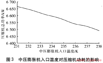 圖3是在固定原料氣壓縮后壓力和制冷劑進(jìn)入冷箱壓力的情況下,原料氣壓縮機(jī)和制冷劑壓縮機(jī)總功率隨著中壓膨脹機(jī)入口溫度的變化曲線。由圖3可見,隨著中壓膨脹機(jī)入口溫度升高,系統(tǒng)總功耗減小。這是因?yàn)殡S著中壓膨脹機(jī)入口溫度升高,1號(hào)換熱器熱負(fù)荷減小,隨之系統(tǒng)總熱負(fù)荷減小,故制冷劑壓縮機(jī)功耗降低。但中壓膨脹機(jī)入口溫度不能過(guò)高,否則2號(hào)換熱器將出現(xiàn)負(fù)溫差而不能正常工作。