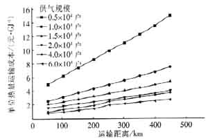 ④ LNG供氣經(jīng)濟性良好,供氣成本在2.15~2.77元/m3內變化。但對于15×1O4戶以下的供氣規(guī)模不適合遠距離運輸,因為隨著運輸距離的增加,這些規(guī)模的供氣成本增加較大。