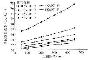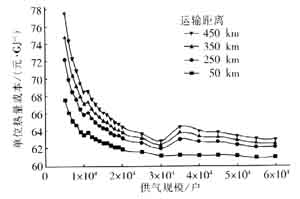 圖6 單位熱量運輸成本隨供氣規(guī)模的變化曲線