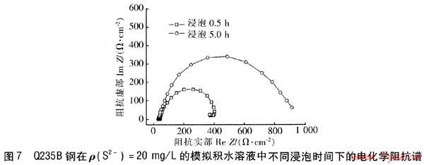 圖7為Q235B鋼在ρ(S2-)=20mg/L的模擬積水溶液中分別浸泡0.5h和浸泡5h所得的電化學(xué)阻抗譜。由圖7可知,隨浸泡時(shí)間的不同,Nyquist圖的形狀有明顯不同。浸泡時(shí)間短時(shí),Nyquist圖由一個高頻容抗弧和一個低頻小感抗弧組成。當(dāng)浸泡時(shí)間由0.5h增大到5h時(shí),Nyquist圖表現(xiàn)為一個大容抗弧,低頻感抗弧已經(jīng)消失,且大容抗弧的半徑顯著變大,即其阻抗增大。說明在模擬積水溶液中,隨著浸泡時(shí)間的延長,S2-對Q235B鋼表面電化學(xué)反應(yīng)的抑制作用增強(qiáng)。