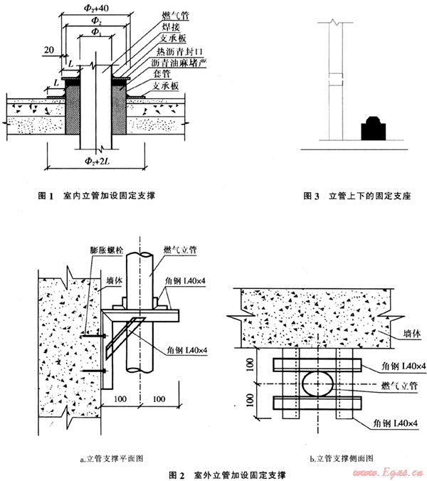 高層建筑物的樓層數(shù)較多,燃氣立管的長度也較長,管道的自重較重,產(chǎn)生的壓應(yīng)力很大。為了使整個立管自重能均勻分攤,應(yīng)在建筑物中每隔一定的距離設(shè)置管道的固定支架,使固定支架與建筑物成為一體,以減少立管底部壓縮應(yīng)力過于集中,防止因管道下沉而引起引入管受力折斷或變形引起倒坡。一般固定立管的做法有:
