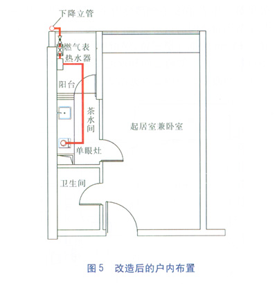 由于業(yè)主強(qiáng)烈要求不僅熱水器要供燃?xì)?,茶水間內(nèi)的單眼灶也需要用燃?xì)?。因此,我們考慮了規(guī)范的要求,茶水間作為廚房用時(shí),在茶水間與起居室兼臥室間增設(shè)實(shí)體墻和門,使茶水間與起居室得到有效隔離,并要求業(yè)主選用帶有自動(dòng)熄火保護(hù)裝置的燃?xì)庠?,這樣就滿足用氣條件。燃?xì)獗砗笕細(xì)夤艿揽梢圆捎勉~管直埋于墻壁,并分兩路,一路在墻壁敷設(shè)引進(jìn)熱水器,另一路沿墻壁下來直接進(jìn)入地板內(nèi)敷設(shè),從而連接單眼灶。這樣熱水器和單眼灶都能使用燃?xì)?。改造后的戶?nèi)布置見圖5。
